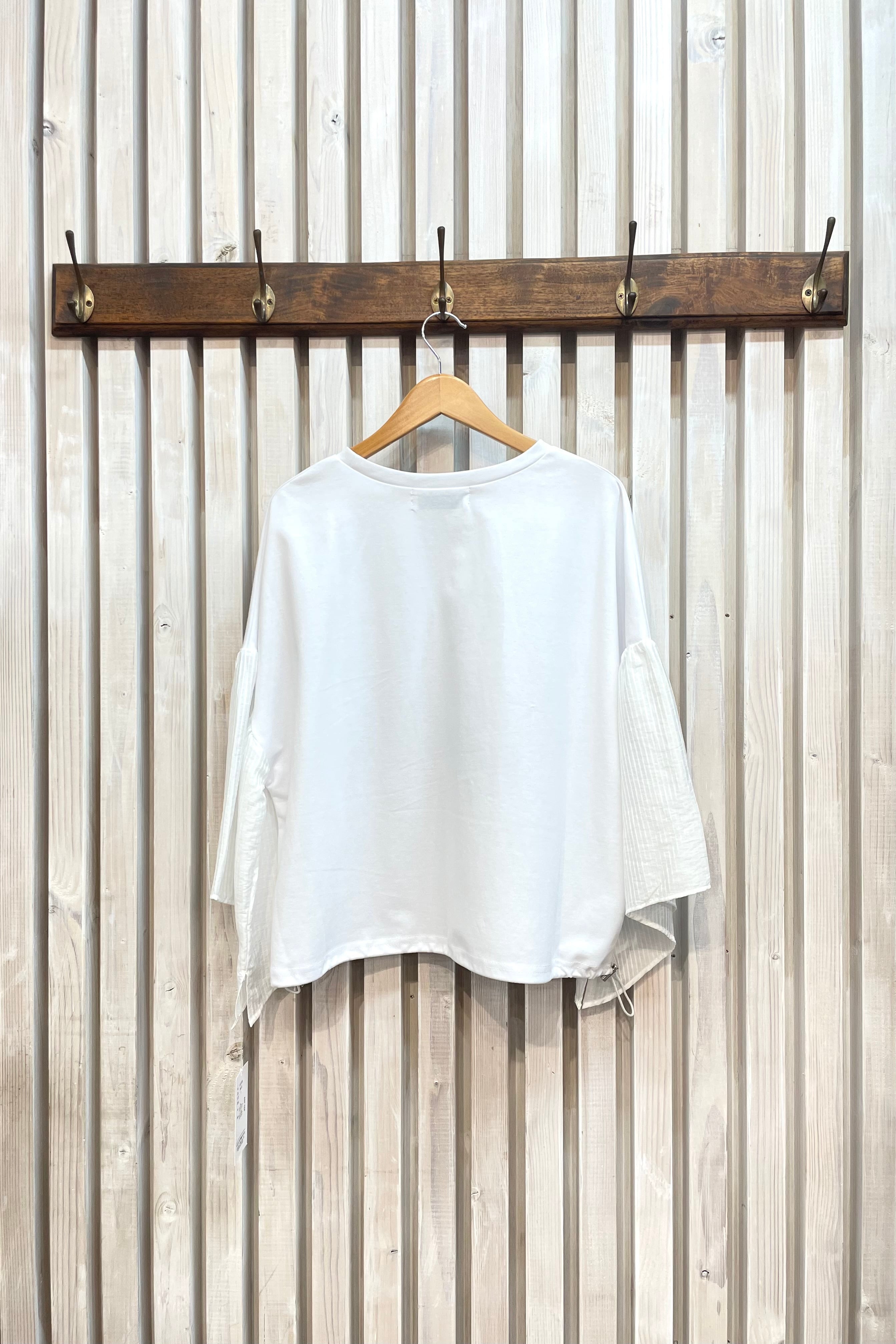 お袖はストライプのシャツ素材になっており、斜めにカットされているので、スッキリとした印象に。