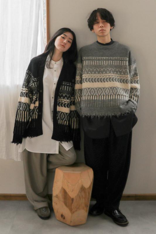 ふわっとした柔らかいモヘア混の糸をベースに、ラムウールナイロンのヴィンテージ風な粗野感のある糸でアイボリーの配色を施したジャガード編みのニット。