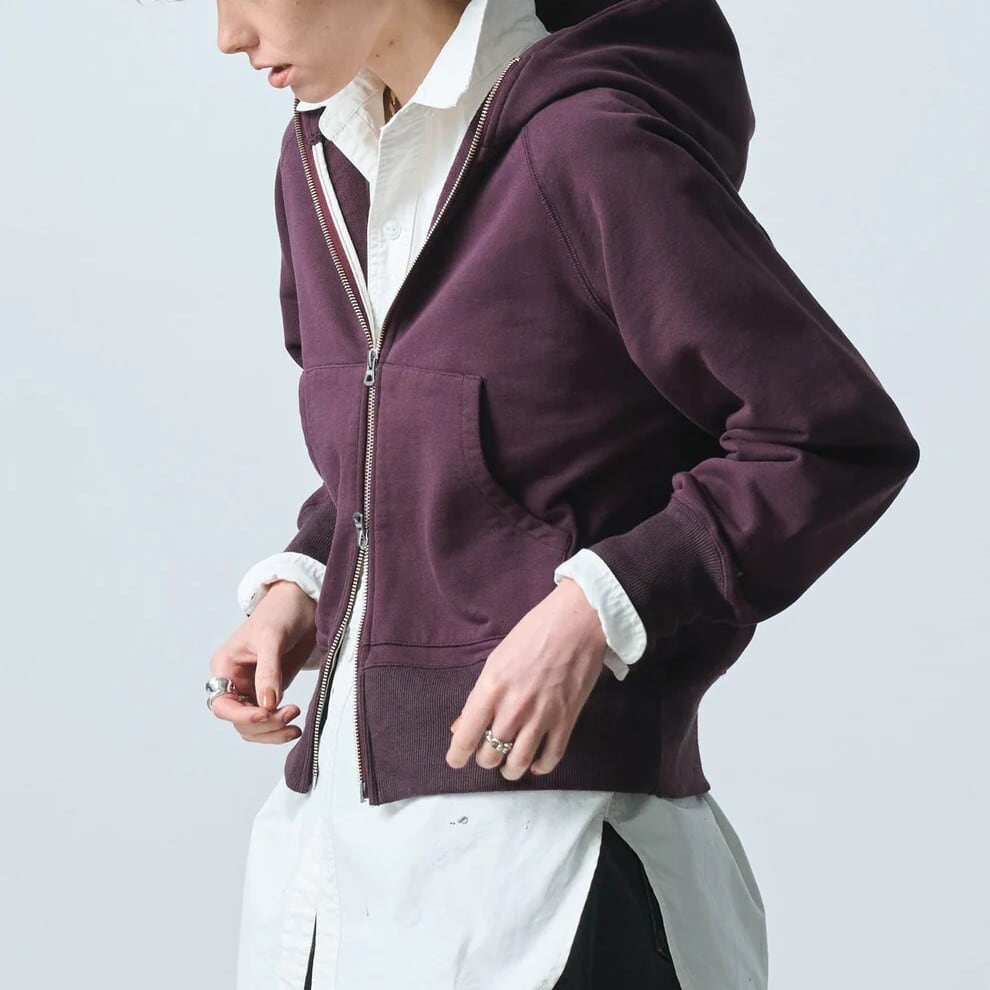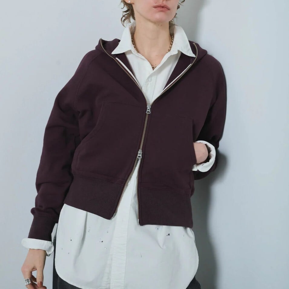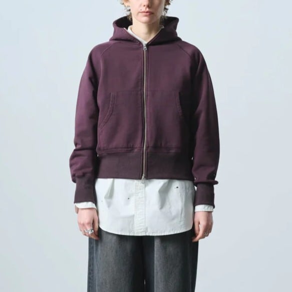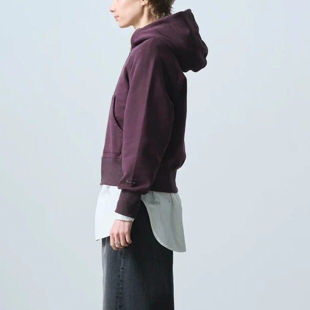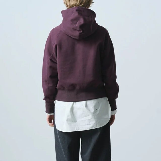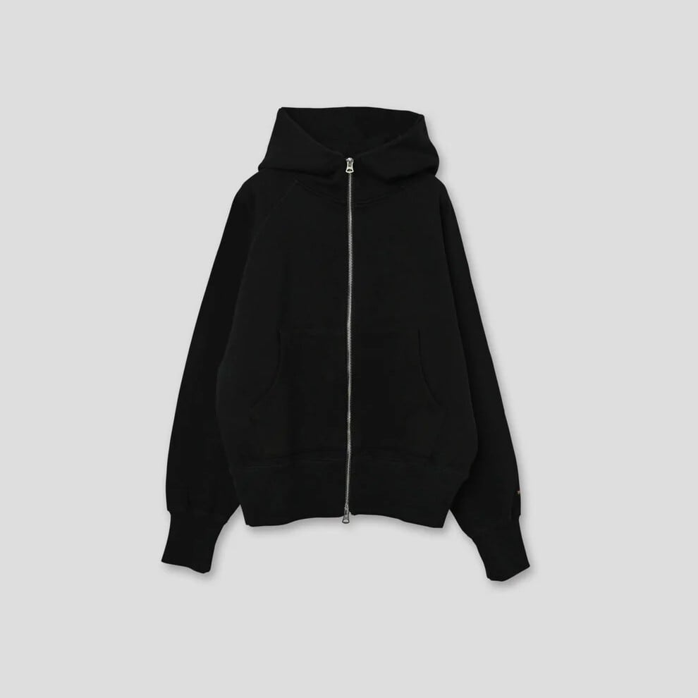 フロントに高さをもたせたアウターのようなフードが特徴的なスウェットパーカーです。