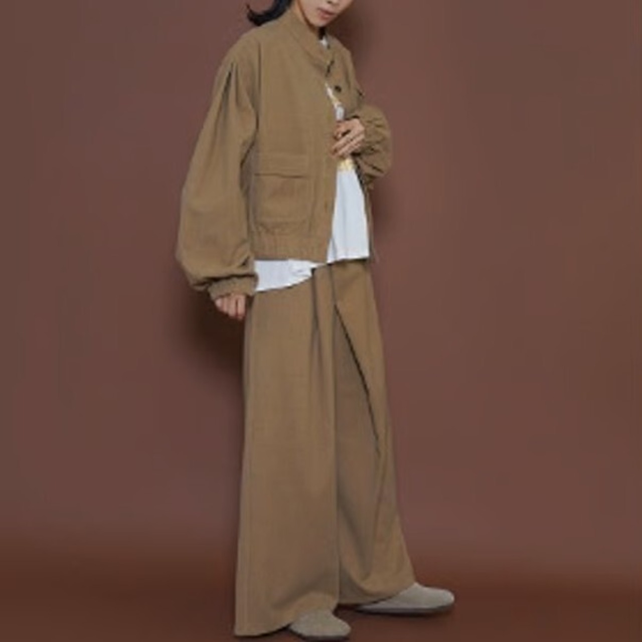 ゆったりとしたワイドスリーブとショート丈のバランスが絶妙にマッチしています。