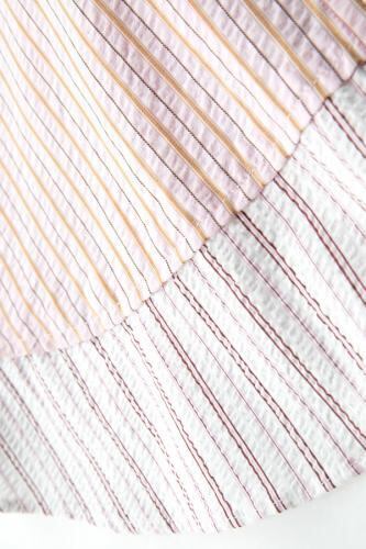 見た目の凹凸感とハリのある風合いが特徴で、異なるストライプ柄をドッキングしたデザイン。