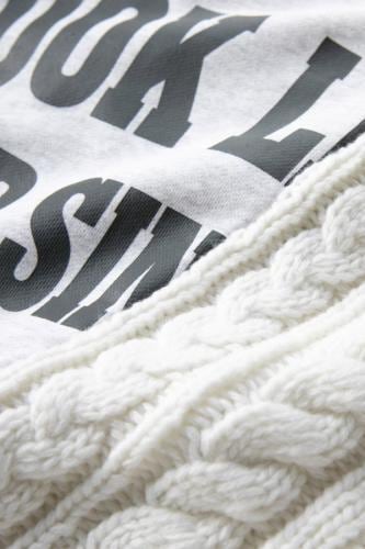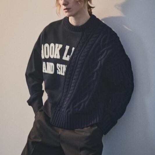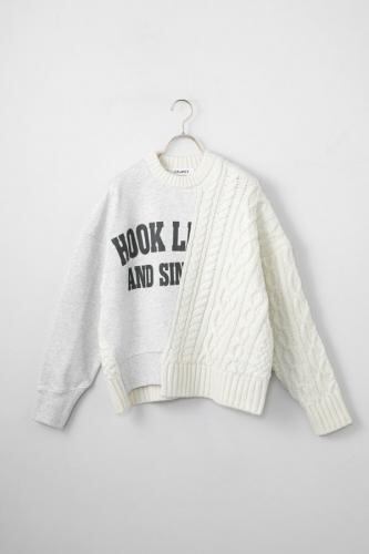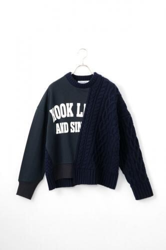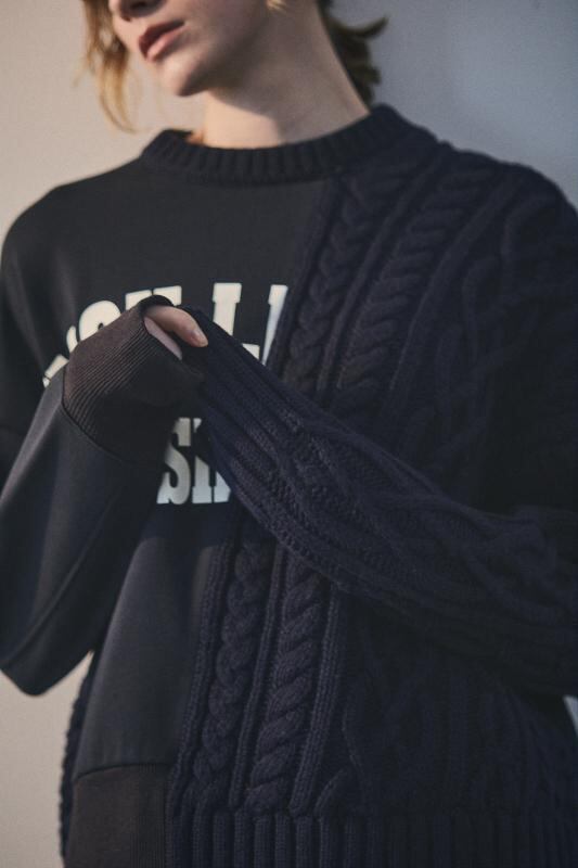 凹凸感のあるケーブルニットと、ロゴプリントを施した裏毛スウェットをドッキングしたデザインプルオーバーです。