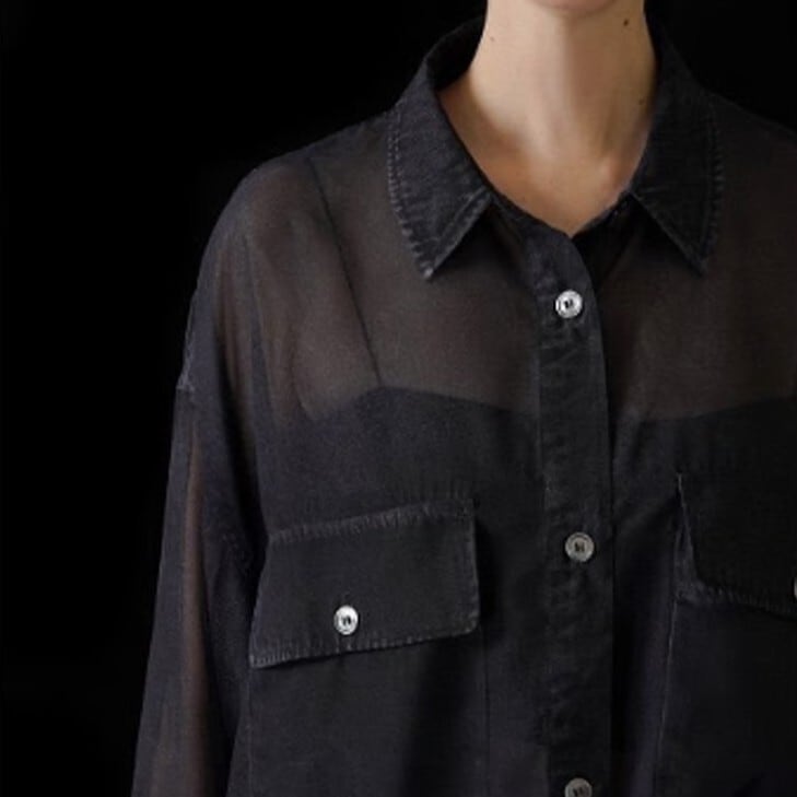 かっこいい雰囲気のデニム転写シアーシャツ。