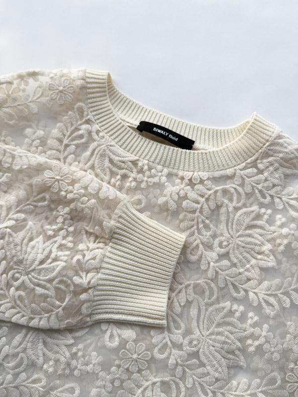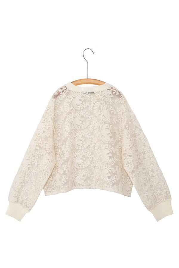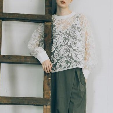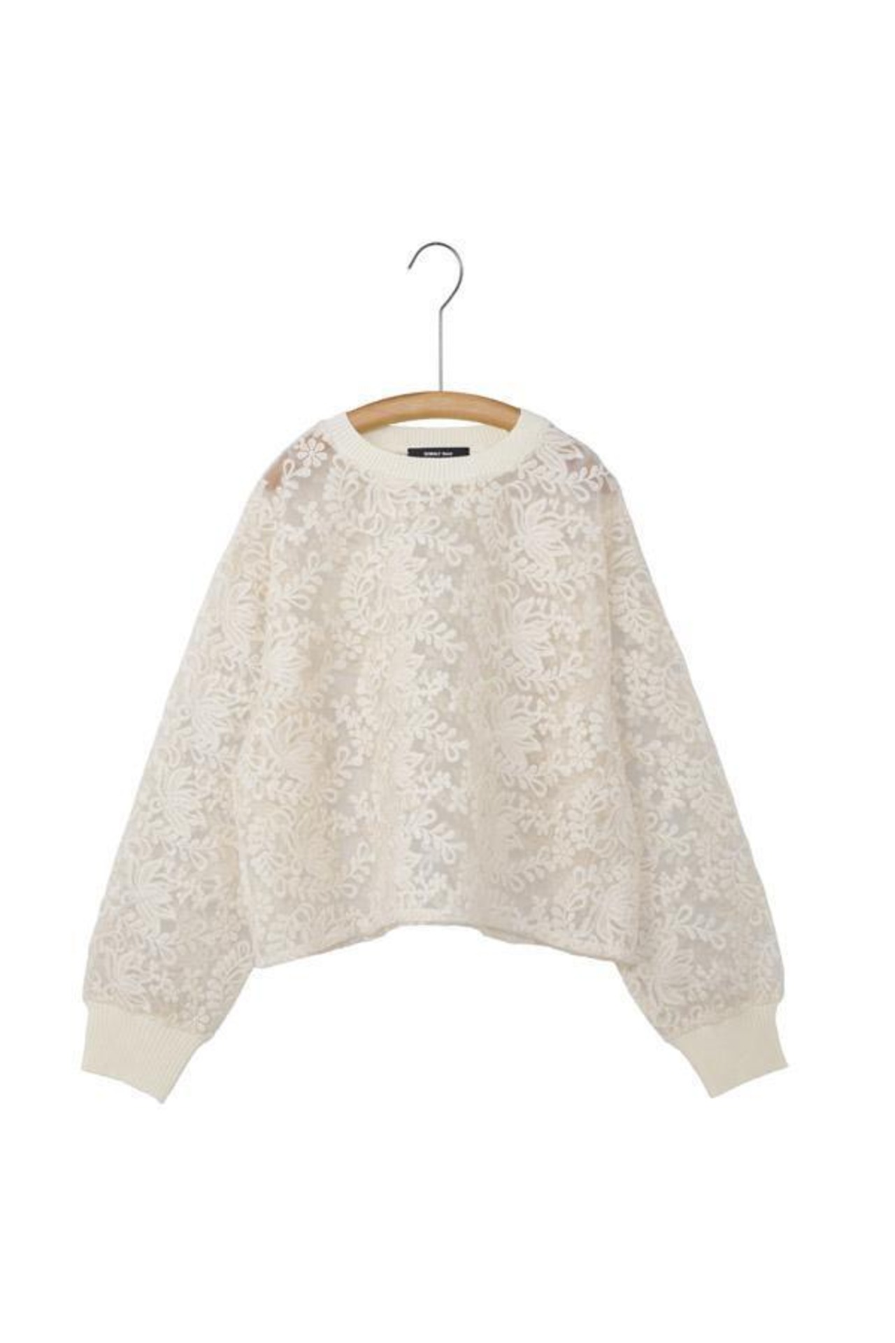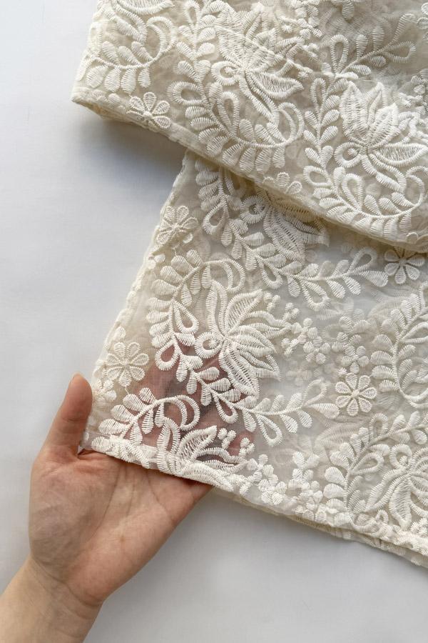 生成のレース生地は、透け感のあるオーガンジーに施されたコットンの刺繍が目を引きます。