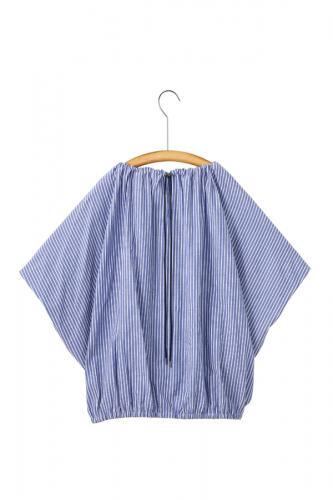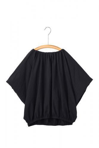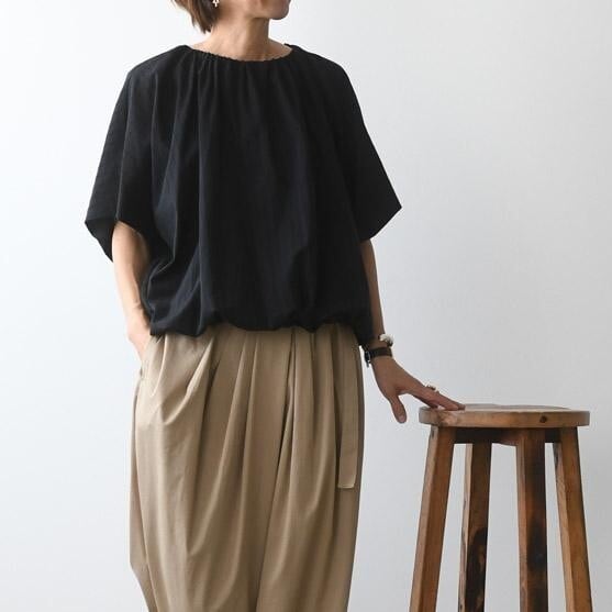 袖口がタックの奥に隠れるデザインで、衿ぐりはドローコードで広がり具合を調節でき、部分ゴムを使用することで着脱しやすい仕様になっております。